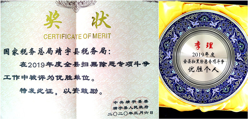 靖宇縣稅務局黨委在掃黑除惡專項斗爭工作中,提高政治站位,在思想上、行動上同黨中央保持高度一致,全局上下齊心協力,不折不扣貫徹落實掃黑除惡專項斗爭工作。近日,靖宇縣稅務局被靖宇縣委授予2019年度掃黑除惡專項斗爭優勝單位,一名干部被授予優秀個人稱號。