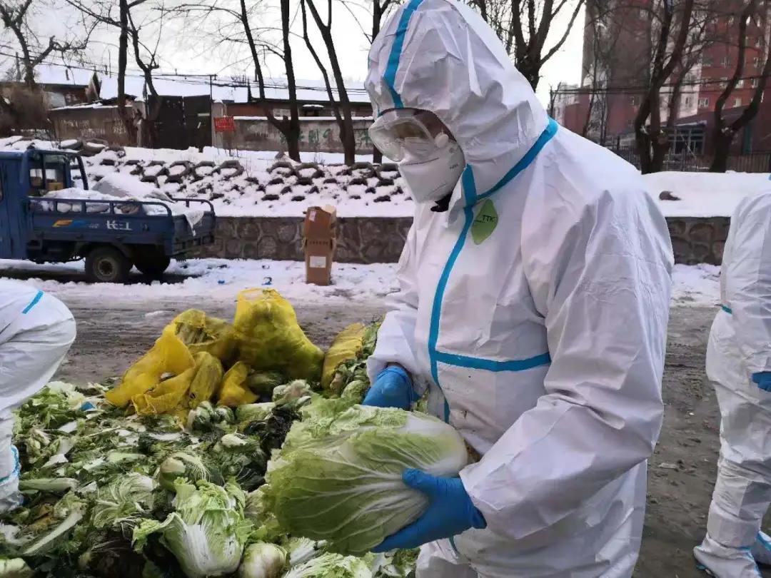 26日12時(shí)左右,山城通化驟降大雪,在老站街道洞泉社區(qū)左岸樺苑小區(qū)門口,一群身著防護(hù)服的“大白人”,頂著寒冷和疲憊,正在分揀、打包剛剛卸下的多種蔬菜,干警們將每種不同的蔬菜均勻的分裝成一個(gè)個(gè)蔬菜包,然后逐一配送菜到戶。為了保證居民發(fā)放到手的蔬菜新鮮,干警們還要在現(xiàn)場將蔬菜進(jìn)行簡單的處理,同時(shí)還有專門干警負(fù)責(zé)處理現(xiàn)場的蔬菜殘留。