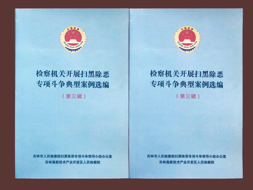 為深入貫徹落實高檢院黨組關于掃黑除惡專項斗爭要堅持法治思維,確保專項斗爭始終在法治軌道上運行的要求,吉林高新區人民檢察院以高檢院及“兩高”“兩部”文件為指導內容,由黨組書記牽頭安排部署,經黨組成員多次研究確定內容和版式,精心匯編,印制成《檢察機關開展掃黑除惡專項斗爭典型案例選編(第三輯)》一書。