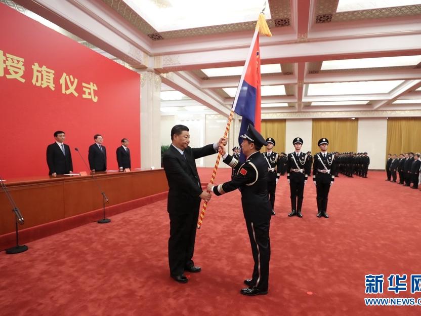 8月26日,中國(guó)人民警察警旗授旗儀式在人民大會(huì)堂舉行。中共中央總書(shū)記、國(guó)家主席、中央軍委主席習(xí)近平向中國(guó)人民警察隊(duì)伍授旗并致訓(xùn)詞。這是習(xí)近平向中國(guó)人民警察隊(duì)伍授旗。新華社記者鞠鵬攝