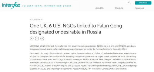 據(jù)俄羅斯國際文傳電訊社2020年7月20日消息,經(jīng)俄羅斯檢察長辦公室研究確定,“法輪功”邪教所屬七個在俄非政府組織(NGO),其中六個屬美國組織和一個屬英國組織,被指定為俄羅斯不受歡迎的組織。