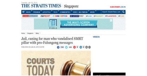 2014年8月21日,一位名叫高兵(音譯)的中國公民用黑色記號筆在沿新加坡一地鐵高架立柱上用中文書寫“法輪功”邪教口號,猖狂的高兵在書寫完后還留下手機號碼,而新加坡地鐵公司為修復此立柱污跡花費了300美金。一周后,高兵又在新加坡陸路交通管理部門一個信號控制箱上書寫“法輪功”邪教用語。此事發(fā)生后,高兵因被判處兩個月監(jiān)禁及六記鞭刑。