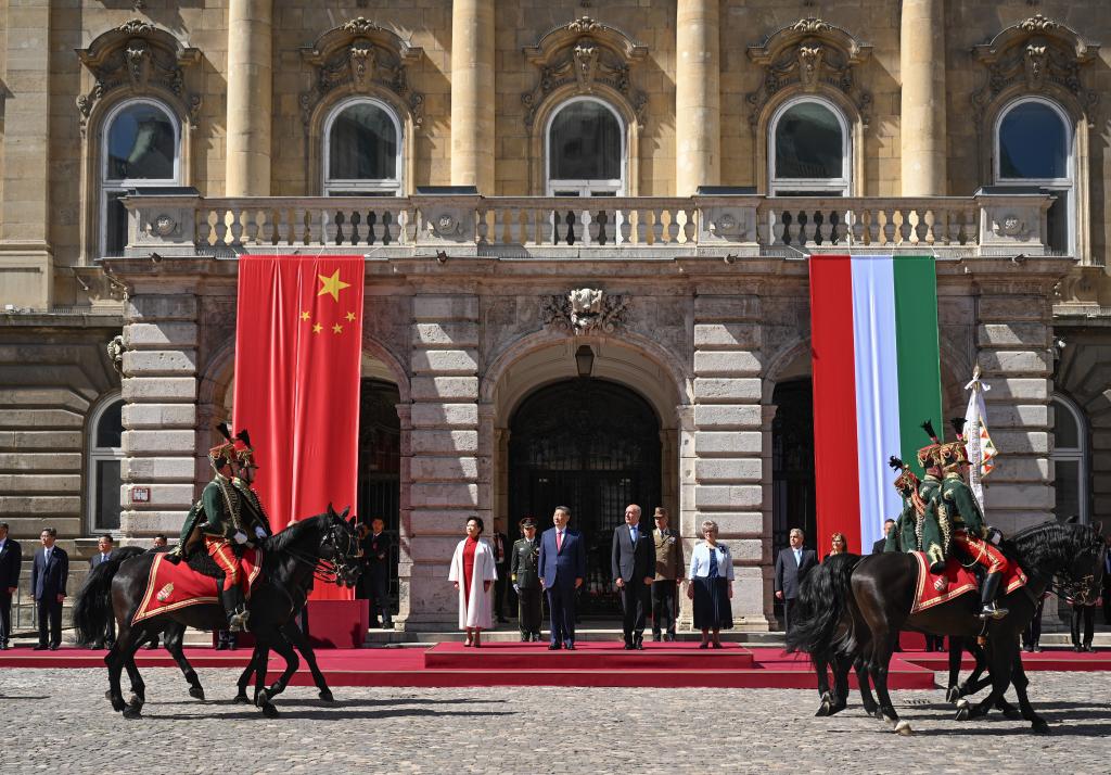 當?shù)貢r間5月9日,習近平主席在布達佩斯出席匈牙利總統(tǒng)舒尤克和總理歐爾班共同舉行的隆重歡迎儀式。新華社記者 謝環(huán)馳 攝