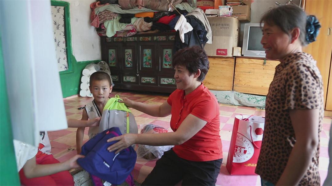 呂淑華與搜登站下洼子村鞠華家人在一起,并給孩子送上隨身攜帶的書包、衣物等物品。