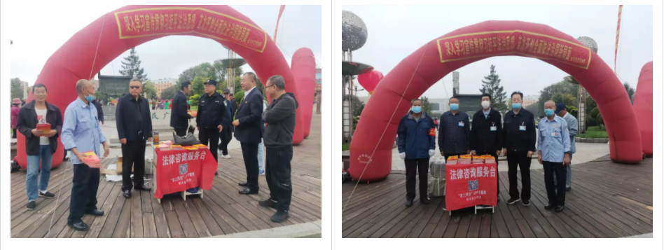 蛟河市法學會于9月17日在蛟河市人民廣場舉辦 “為民辦實事、送法到基層”大型活動。市委常委、政法委書記、法學會會長郝玉智,市委政法委常務副書記、法學會常務副會長徐寶林參加了活動并講話。受法學會邀請律師、法律工作者現(xiàn)場回答群眾所提出的相關法律問題;蛟河市法學會現(xiàn)場印制了“掌上問法”APP二維碼,供現(xiàn)場群眾下載;蛟河市長安街社區(qū)五名三賢人士及法學會工作人員發(fā)放民法典宣傳手冊1萬余份,宣傳兜子1000個。為了擴大影響面,蛟河市法學會還邀請了新區(qū)秧歌隊前來助陣,活躍了活動現(xiàn)場的氣氛。