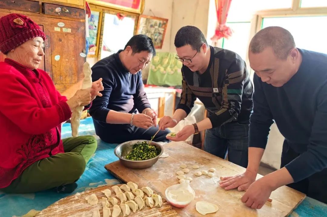 駐村民警們分工有序、默契配合地剁餡、和面、攪餡、搟皮、包餃子。民警們和王大娘一邊包餃子一邊嘮家常,和王大娘聊一聊天氣變化,嘮一嘮身體狀況,問一問日常起居,其樂融融的情景就像一家人一樣。