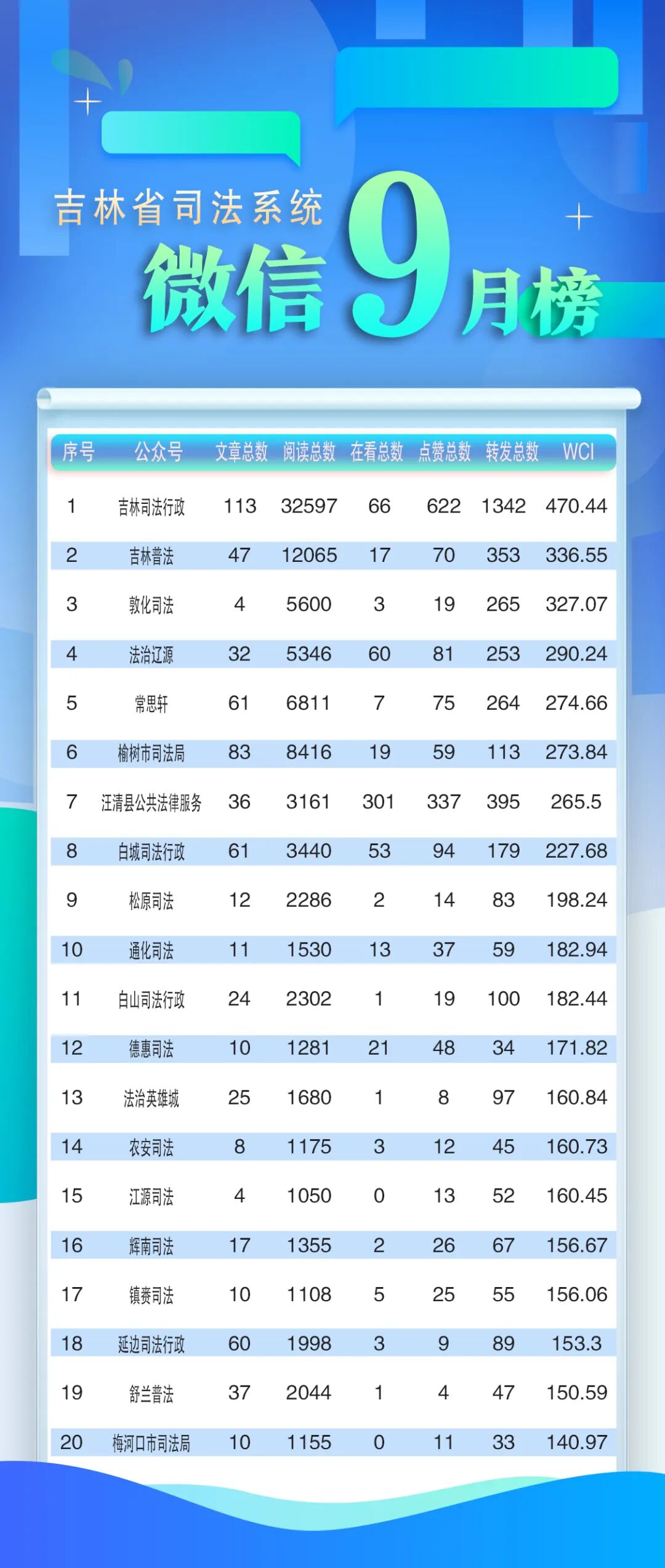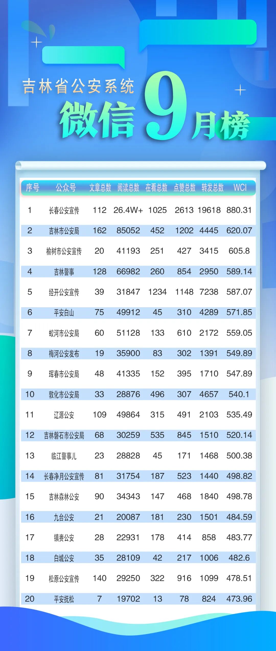 恭喜“長(zhǎng)春公安宣傳”獲得本月微信公眾號(hào)總榜第一名!“吉林省高級(jí)人民法院”獲得總榜第二名,“吉林市公安局”獲得總榜第三名。