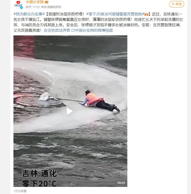 媒體聚焦 |《中國長安網》:救援時冰層突然坍塌!零下20度冰河里輔警冒死營救她"/>