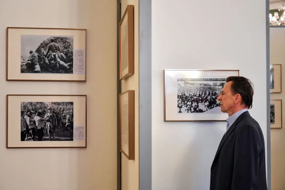 4月18日,在俄羅斯首都莫斯科,嘉賓參觀紀念中國人民抗日戰爭暨世界反法西斯戰爭勝利80周年圖片展。