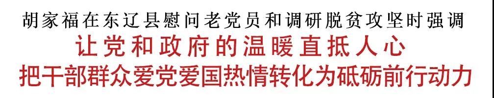 金秋時節,金州鄉雙福村處處生機盎然、洋溢著豐收的喜悅。胡家福一入東遼縣首先就來到這里,向3名建國前參加革命工作的老黨員致以衷心的祝福,并為每人送去2000元慰問金。在雙福村村部,胡家福與17歲入黨、現年88歲的老黨員和鳳春促膝交談,詳細詢問其家庭情況、飲食起居和身體狀況,一起回憶革命戰爭時期的崢嶸歲月和中國共產黨走過的光輝歷程。他指出,過去是現在的歷史,今天是昨天的延續。建國前老黨員是打江山、建基業的一代,是我們黨和人民的寶貴財富,正是一代又一代老黨員老同志的艱苦奮斗,才有了我們今天的幸福美好生活。對那些老黨員老同志特別是有功之臣,各級領導干部要保持敬重之心、傾注關愛之情、多做務實之事,用心用力幫助解決生活困難,使他們更好地安享晚年。和鳳春老人動情地說:“沒想到國家發展的這么好,沒想到省領導這么惦記我們,現在我生活好、條件好,非常高興,感謝黨和政府的關懷,一定不忘黨員本色,為建設家鄉、振興吉林多出主意、多做貢獻”。