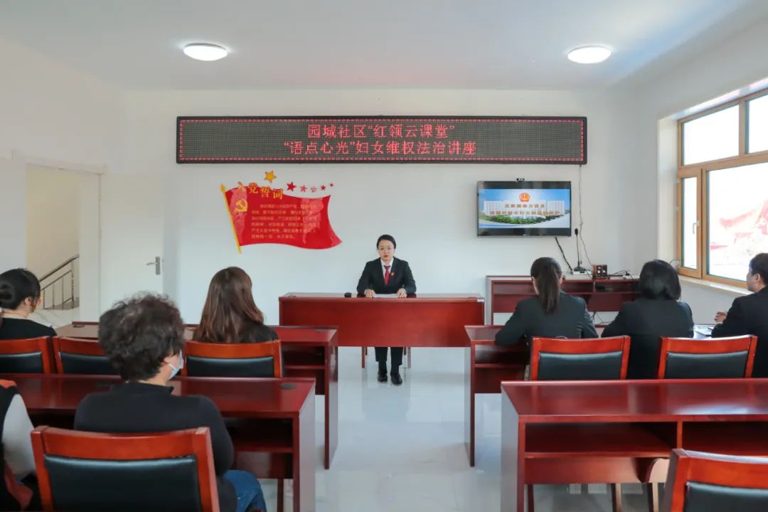 在園城社區,法院干警向社區干部和群眾詳細講解了人身安全保護令的適用條件,申請人身安全保護令應當提交的手續材料,法院對人身安全保護令申請的審查、裁定與送達,以及人身安全保護令的生效與執行等內容,與現場聽眾進行了互動交流。現場工作人員將這節講堂全程錄像并上傳到“紅領云課堂”中,社區內的居民可以通過手機進行學習。