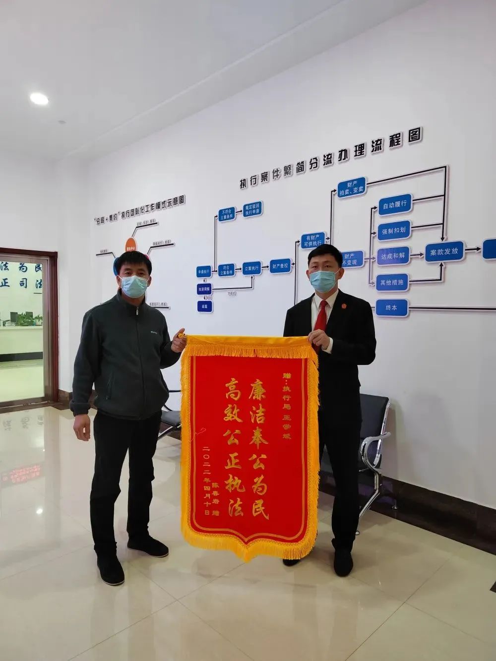 王學斌接收案件后,迅速梳理案情并核查了被執行人周某名下的財產線索,第一時間查封了周某名下車輛車籍并將車輛進行扣押。秉持著為群眾辦實事的理念,王學斌聯系雙方當事人來院約談還款事宜,在他的積極調解下,雙方最終達成和解協議。和解當天,周某自行出售其名下車輛并給付申請執行人陳某大部分執行款,并承諾余款4月1日前全部履行完畢。在居家隔離期間,王學斌仍不忘提醒周某一定要積極履行還款義務。復工當天,王學斌再一次撥通了周某的電話囑咐其還款。次日陳某收到還款后便立刻為王學斌送來了“廉潔奉公為民,高效公證執法”的錦旗,以示感謝!